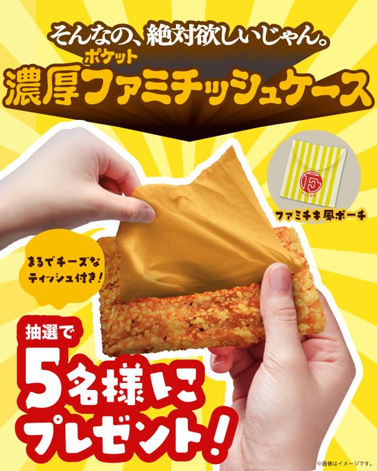 ファミリーマート公式Xアカウント@famima_nowをフォローし、対象の投稿に指定のハッシュタグをつけて、リプライすると抽選で「ファミチキティッシュ」が5名様に当たります。