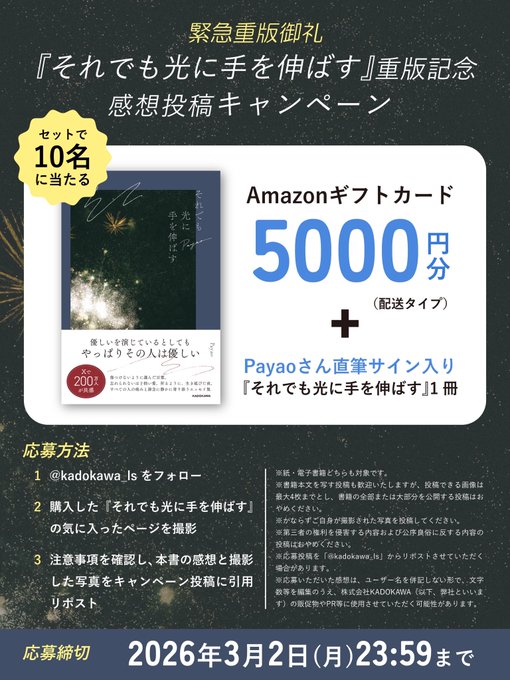 賞品:Amazonギフトカード5000円分&Payaoさん直筆サイン入り『それでも光に手を伸ばす』1冊(10名様)