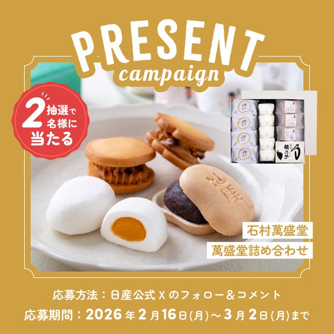【X・Instagram懸賞】石村萬盛堂の萬盛堂詰め合わせを2名様にプレゼント 2026.02.28日産福岡販売株式会社‐石村萬盛堂の 萬盛堂詰め合わせ プレゼントキャンペーン 賞品:石村萬盛堂の萬盛堂詰め合わせ(2名様) 締切:2026年3月2日(月)応募方法 1)アカウントをフォロー 2)投稿にコメントInstagramからも応募できます。※詳細はキャンペーンページにてご確認ください。応募はこちらから