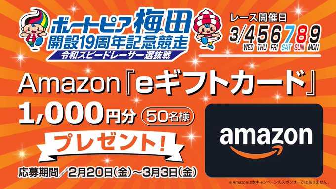 【X懸賞】Amazonギフト券1,000円分を50名様にプレゼント 2026.03.01ボートレース住之江‐プレゼントキャンペーン 賞品:Amazon eギフトカード1,000円分(50名様) 締切:2026年3月3日(火)①フォロー ②投稿にいいね、リポスト※詳細はキャンペーンページにてご確認ください。応募はこちらから