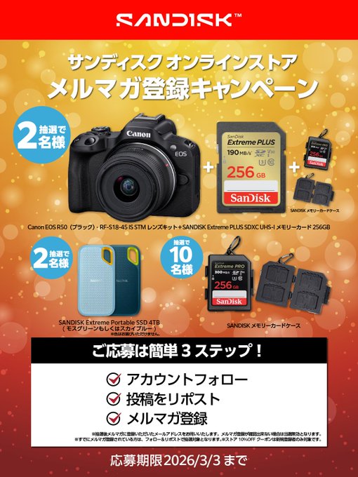 賞品:Canon EOS R50レンズキットやSANDISK Extreme Portable SSDなど(合計14名様)