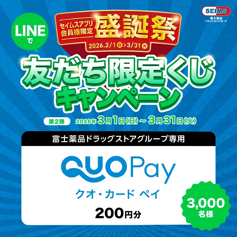 【毎日・LINE懸賞】富士薬品ドラッグストアグループ専用QUOカードPay200円分が3,000名様にその場で当たる! 2026.03.01富士薬品ドラッグストアグループ‐友だち限定くじキャンペーン 賞品:富士薬品ドラッグストアグループ専用QUOカードPay200円分(3,000名様) 締切:2026年3月31日(火)キャンペーンページからご応募ください。※詳細はキャンペーンページにてご確認ください。応募はこちらから