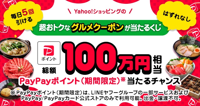 【毎日応募】PayPayポイント最大10万円相当、Yahoo!ショッピングで使える超おトクなグルメクーポンがその場で当たる!