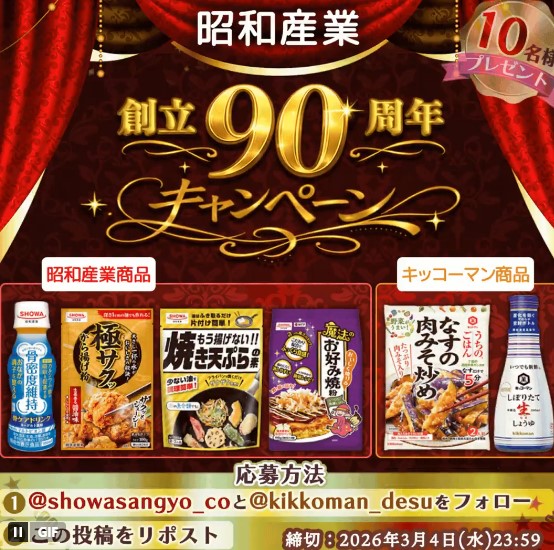 @kikkoman_desuと@showasangyo_coをフォロー&キャンペーン対象ポストをリポストしてご応募ください。