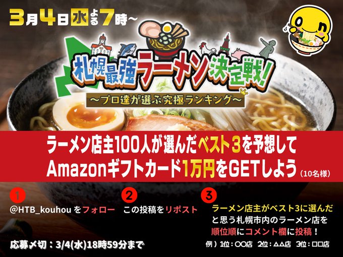 HTB北海道テレビ‐ラーメン店主が選んだラーメン店ベスト3 予想キャンペーン