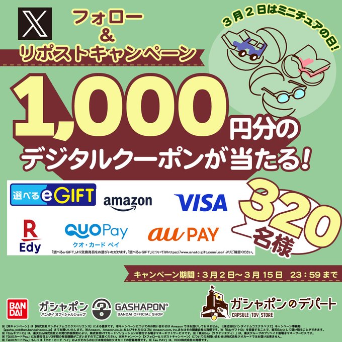 『ガシャポンバンダイオフィシャルショップ』『ガシャポンのデパート』3月2日はミニチュアの日キャンペーン