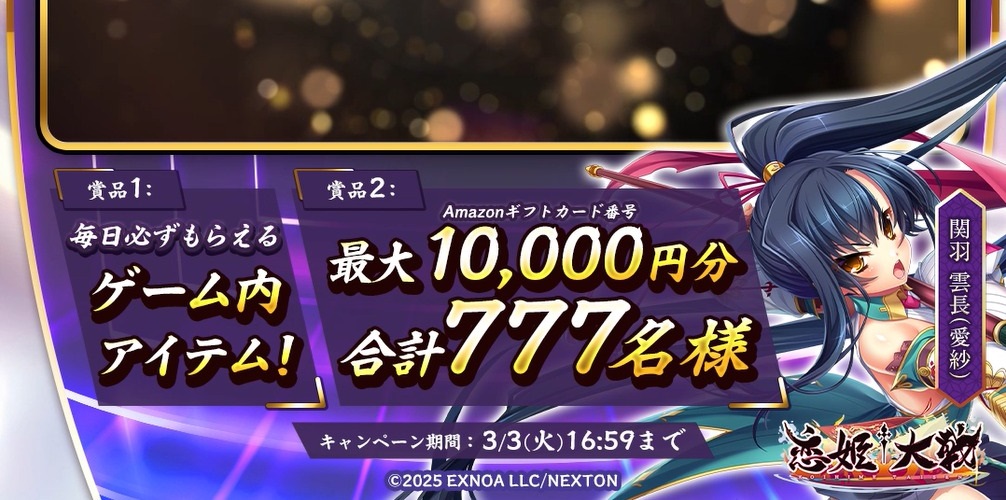 賞品:Amazonギフト券最大10,000円分(777名様)