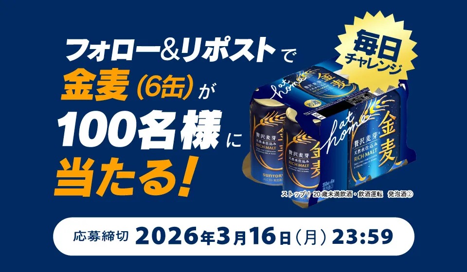 【毎日・X懸賞】金麦 350ml×6缶を100名様にプレゼント 2026.03.02金麦3月CM公開フォロリポキャンペーン 賞品:金麦 350ml×6缶(100名様) 締切:2026年3月16日(月)サントリー公式Xアカウントをフォロー&キャンペーン対象ポストをリポストしてご応募ください。※詳細はキャンペーンページにてご確認ください。応募はこちらから