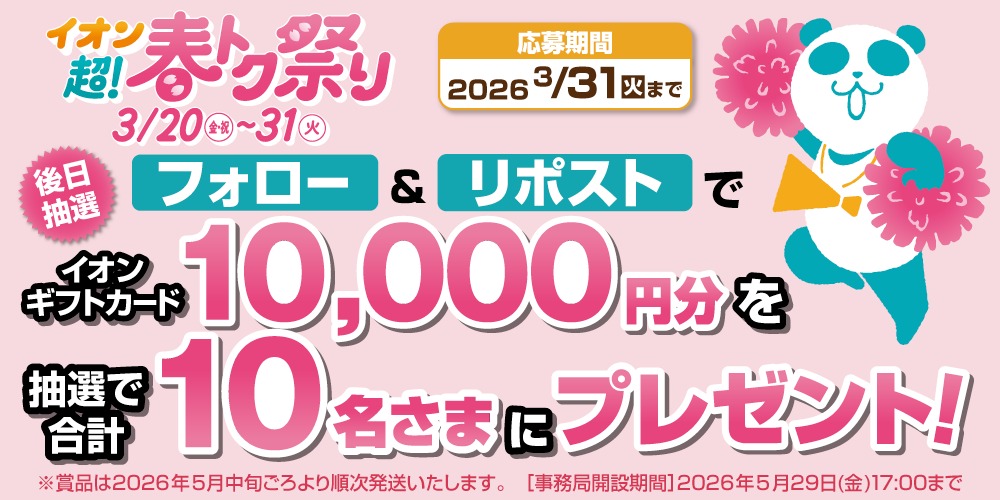 【毎日・X懸賞】イオンギフトカード10,000円分を10名様にプレゼント 2026.03.02イオン‐フォロー&リポストキャンペーン 賞品:イオンギフトカード10,000円分(10名様) 締切:2026年3月31日(火)イオン公式Xアカウントをフォロー&キャンペーン対象ポストをリポストしてご応募ください。※詳細はキャンペーンページにてご確認ください。応募はこちらから