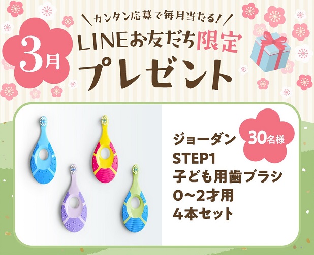 【LINE懸賞】ジョーダン STEP1 子ども用歯ブラシ 0~2才用 4本セットを30名様にプレゼント 2026.03.02ミキハウス子育て総研‐LINEお友だち限定プキャンペーン 賞品:ジョーダン STEP1 子ども用歯ブラシ 0~2才用 4本セット(30名様) 締切:2026年3月31日(火)アンケートに答えてご応募ください。※詳細はキャンペーンページにてご確認ください。応募はこちらから