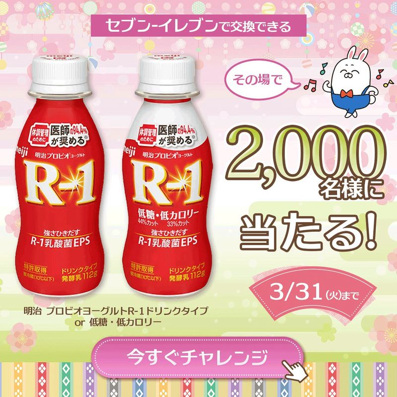 【LINE懸賞】明治プロビオヨーグルトR-1 無料引き換えクーポンが2,000名様にその場で当たる! 2026.03.02長谷工グループ‐友だち限定 3月のプレゼントキャンペーン 賞品:セブンイレブンで交換できる「明治プロビオヨーグルトR-1」(2,000名様) 締切:2026年3月31日(火)アンケートに答えてご応募ください。※詳細はキャンペーンページにてご確認ください。応募はこちらから