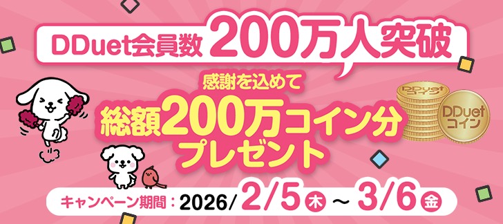 DDuetコイン最大5,000コインを合計2,000名様にプレゼント 2026.03.02DDuet200万会員記念キャンペーン~総額200万コインプレゼント~ 賞品:DDuetコイン最大5,000コイン(合計2,000名様) 締切:2026年3月6日(金)ご応募には会員登録/ログインが必要です。※詳細はキャンペーンページにてご確認ください。応募はこちらから