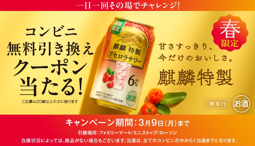 賞品:麒麟特製 アセロラサワー コンビニ無料引き換えクーポン(6万5千名様)
