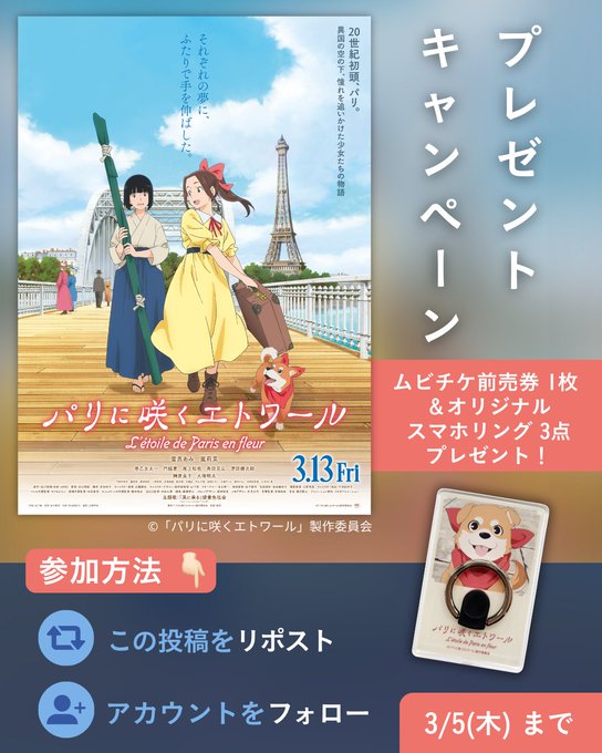 【X懸賞】劇場アニメ『パリに咲くエトワール』ムビチケ前売券1点+オリジナルスマホリング3点をプレゼント