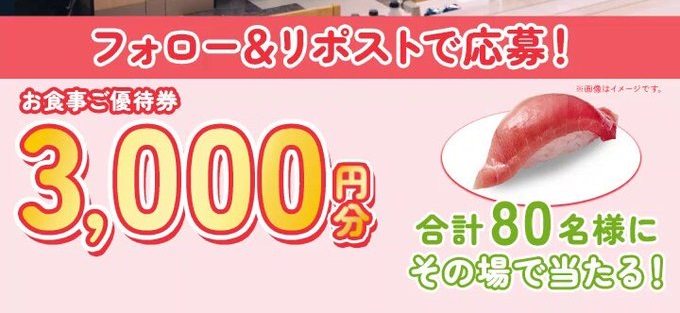 賞品:はま寿司で使えるお食事ご優待券3,000円分(80名様)