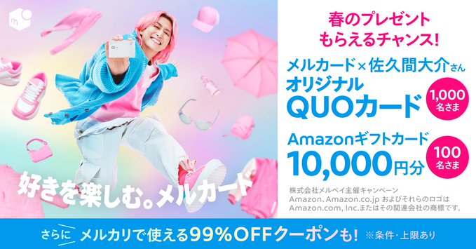 賞品:メルカード×佐久間大介さんオリジナルQUOカード1,000円分(1,000名様)