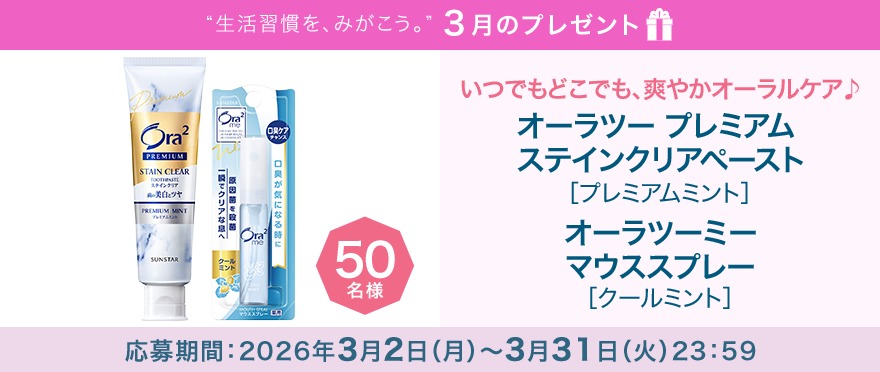 賞品:オーラツー プレミアム ステインクリア ペースト プレミアムミント&オーラツーミー マウススプレー クールミント(50名様)