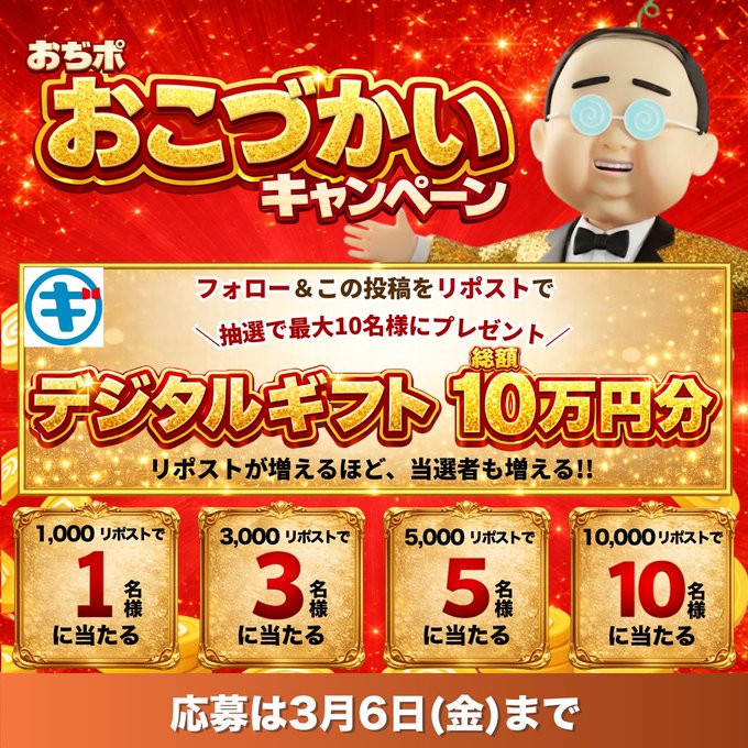 【X懸賞】デジタルギフト1万円分を10名様にプレゼント 2026.03.04#おぢポおこづかい キャンペーン 賞品:デジタルギフト1万円分(最大10名様) 締切:2026年3月6日(金)公式X(Twitter)アカウントをフォロー&キャンペーン対象ポストをリポストしてご応募ください。※詳細はキャンペーンページにてご確認ください。応募はこちらから