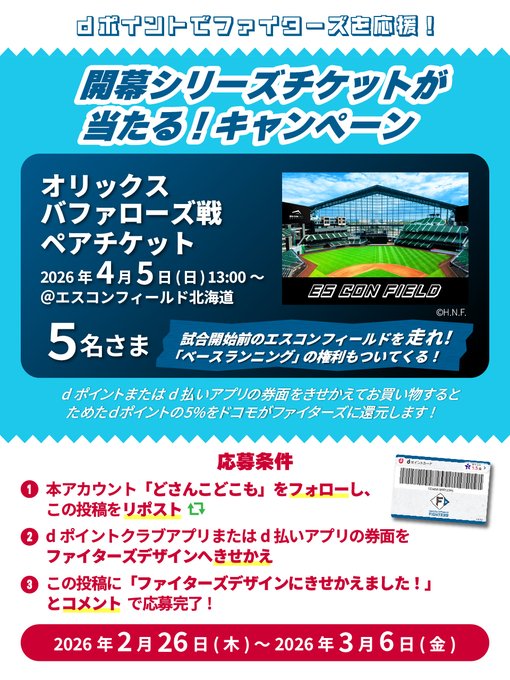 賞品:4/5 エスコンフィールドベースランニング権付きペア観戦チケット(5名様)