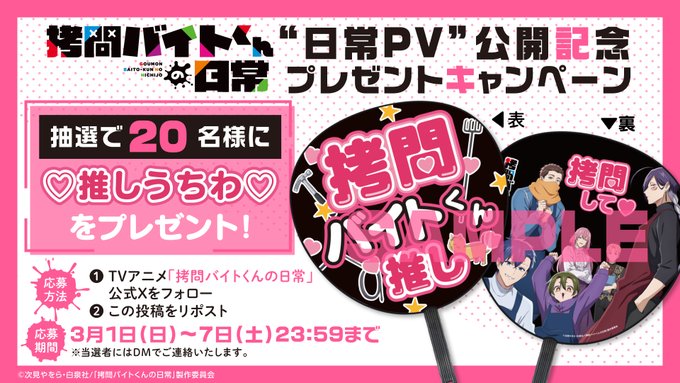 【X懸賞】推しうちわを20名様にプレゼント 2026.03.04TVアニメ「拷問バイトくんの日常」公開記念キャンペーン 賞品:推しうちわ(20名様) 締切:2026年3月7日(土)公式X(Twitter)アカウントをフォロー&キャンペーン対象ポストをリポストしてご応募ください。※詳細はキャンペーンページにてご確認ください。応募はこちらから