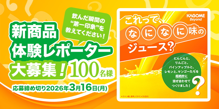 新商品の飲料2本を100名様にプレゼント 2026.03.04&KAGOME‐新商品体験レポーター大募集 賞品:新商品の飲料2本(100名様) 締切:2026年3月16日(月)「体験レポーター」として参加いただける方【100名様】を大募集※詳細はキャンペーンページにてご確認ください。応募はこちらから