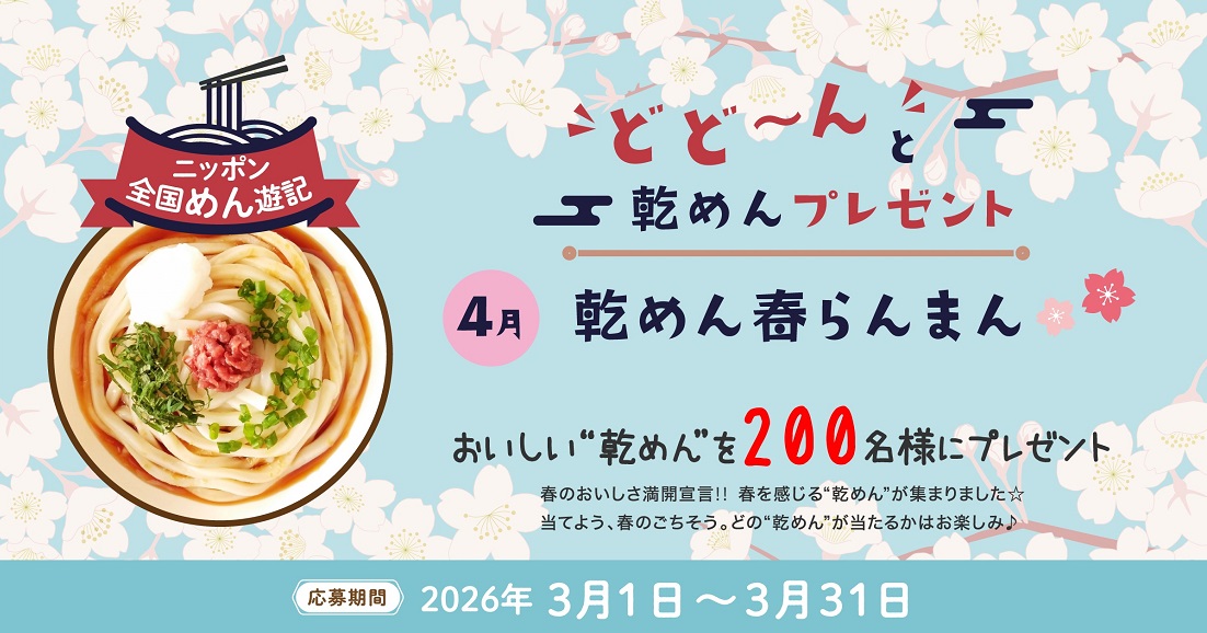 おいしい“乾めん”を200名様にプレゼント 2026.03.05 2026.03.04ニッポン全国めん遊記 どど~んと乾めんプレゼント 賞品:おいしい“乾めん”(200名様) 締切:2026年3月31日(火)アンケートに答えてご応募ください。※詳細はキャンペーンページにてご確認ください。応募はこちらから