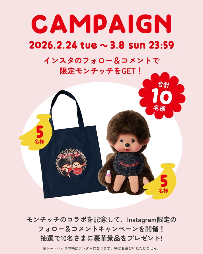 賞品:FREAK’S STORE限定モンチッチアイテムまたはPUBLUXのモンチッチトートバッグ(10名様)