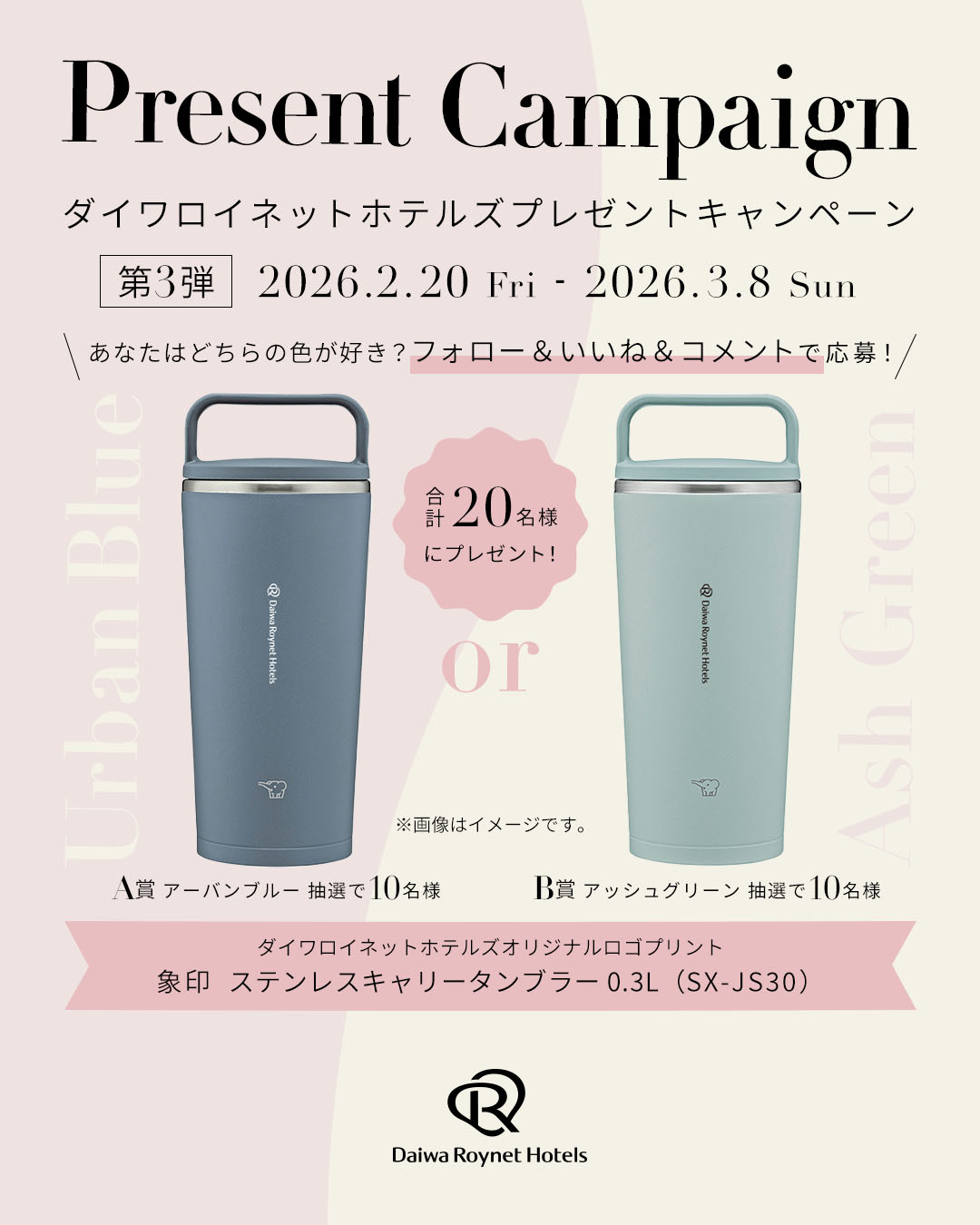 賞品:ダイワロイネットホテルズオリジナルロゴプリント 象印 ステンレスキャリータンブラー 0.3L(20名様)