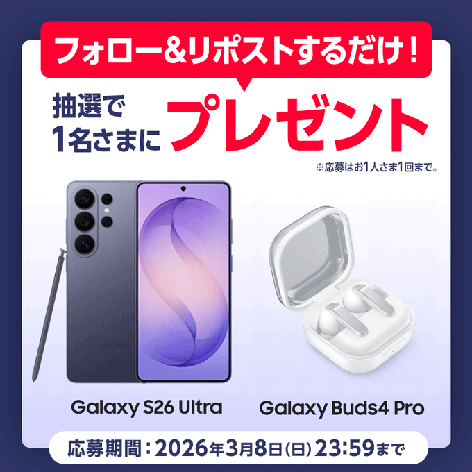 賞品:Samsung Galaxy S26 Ultra と Samsung Galaxy Buds4 Pro(1名様)