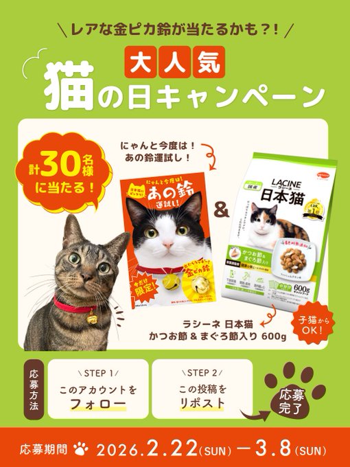 賞品:“ラシーネ日本猫”、“金ピカあの鈴”(30名様)