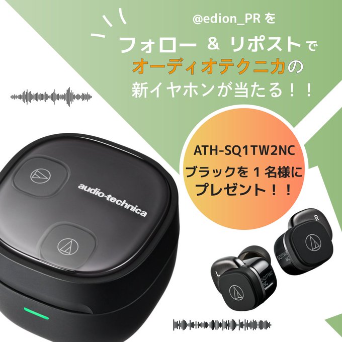 【X・Instagram懸賞】audio-technica ワイヤレスイヤホン ATH-SQ1TW2NCを合計2名様にプレゼント 2026.03.05エディオン‐プレゼントキャンペーン 賞品: audio-technica ワイヤレスイヤホン ATH-SQ1TW2NC ブラック(1名様) audio-technica ワイヤレスイヤホン ATH-SQ1TW2NC-GR(1名様) 締切:2026年3月8日(日)公式X(Twitter)アカウントをフォロー&キャンペーン対象ポストをリポストしてご応募ください。Instagramでも開催中。※詳細はキャンペーンページにてご確認ください。応募はこちらから