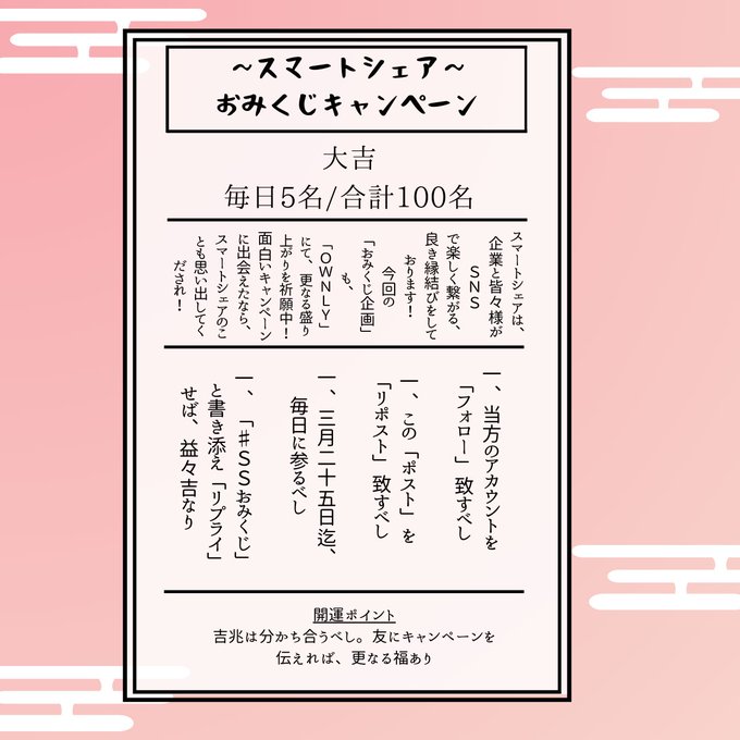 【毎日・X懸賞】QUOカードPay200円分が合計100名様にその場で当たる! 2026.03.05OWNLY‐#SS_3月開運キャンペーン 賞品:QUOカードPay200円分(100名様) 締切:2026年3月25日(水)OWNLY公式Xアカウントをフォロー&キャンペーン対象ポストをリポストしてご応募ください。※詳細はキャンペーンページにてご確認ください。応募はこちらから