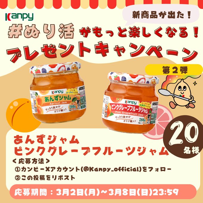 【X懸賞】新商品のジャム2種セットを20名様にプレゼント 2026.03.06カンピー‐フォロー&リポストキャンペーン 賞品:新商品のジャム(20名様) 締切:2026年3月8日(日)公式X(Twitter)アカウントをフォロー&キャンペーン対象ポストをリポストしてご応募ください。※詳細はキャンペーンページにてご確認ください。応募はこちらから