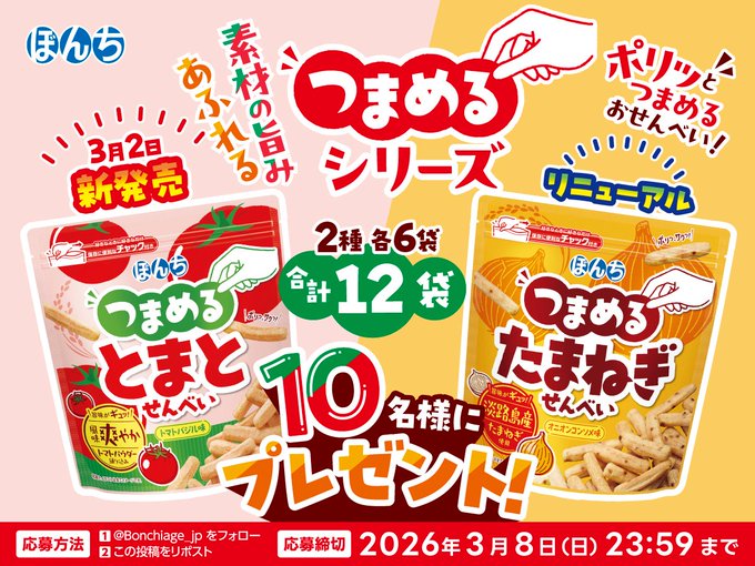 賞品:つまめるとまとせんべい6袋&つまめるたまねぎせんべい6袋(10名様)