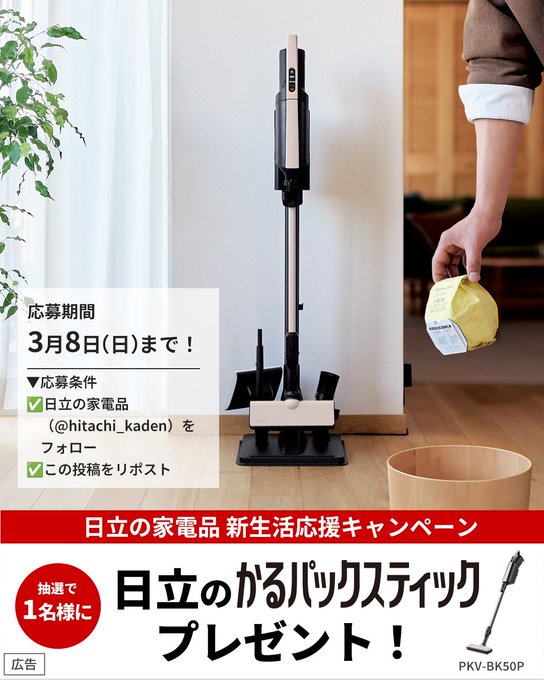賞品:日立の紙パック式スティック掃除機「かるパックスティックPKV-BK50P」(1名様)