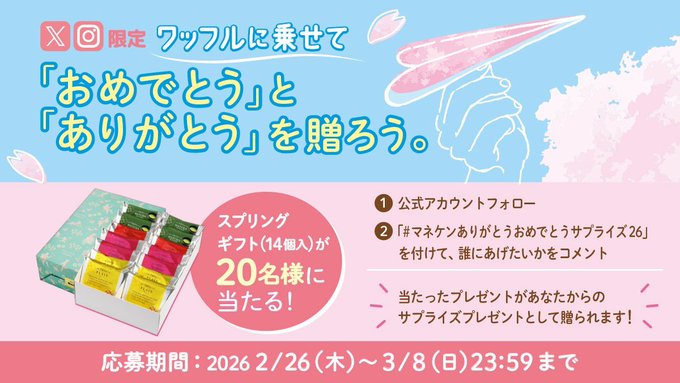 【X・Instagram懸賞】マネケン スプリングギフトを20名様にプレゼント 2026.03.06#マネケンありがとうおめでとうサプライズ26 賞品:スプリングギフト(20名様) 締切:2026年3月8日(日)今までの感謝の気持ちやこれからのエールも込めてワッフルギフトとメッセージカードをともに大切な人へ贈りましょう!Instagramからも応募できます。※詳細はキャンペーンページにてご確認ください。応募はこちらから