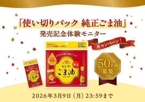 使い切りパック 純正ごま油 5g×6袋入 1袋を50名様にプレゼント 2026.03.07 2026.03.06ごまラボ‐「使い切りパック 純正ごま油」発売記念 体験モニターキャンペーン 賞品:使い切りパック 純正ごま油 5g×6袋入 1袋(50名様) 締切:2026年3月9日(月)ご応募には会員登録/ログインが必要です。※詳細はキャンペーンページにてご確認ください。応募はこちらから