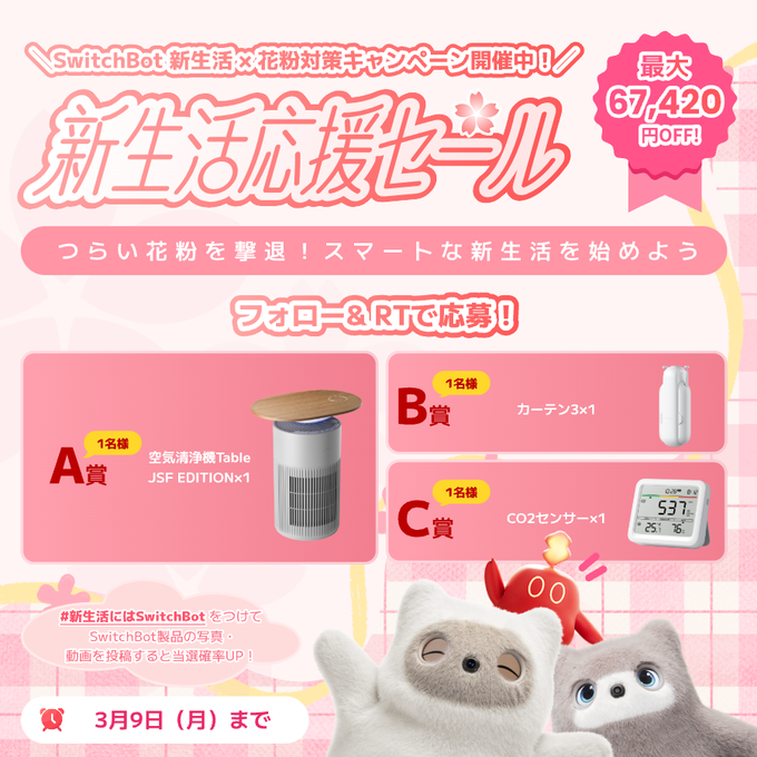 【X・Instagram懸賞】SwitchBot 空気清浄機Table、カーテン3、CO2センサーを合計6名様にプレゼント 2026.03.07SwitchBot Japan‐新生活×花粉対策!応援キャンペーン 賞品:SwitchBot 空気清浄機Table、カーテン3、CO2センサー(6名様) 締切:2026年3月9日(月)🤗応募はフォロー&RTするだけ✅Instagramと同時開催※詳細はキャンペーンページにてご確認ください。応募はこちらから