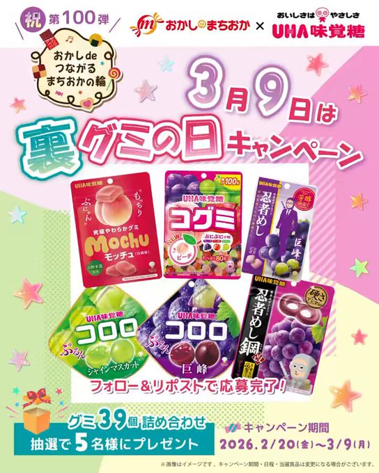 【X懸賞】グミ39個詰め合わせを5名様にプレゼント 2026.03.07おかしのまちおか‐フォロー&リポストキャンペーン 賞品:グミ39個詰め合わせ(5名様) 締切:2026年3月9日(月)公式X(Twitter)アカウントをフォロー&キャンペーン対象ポストをリポストしてご応募ください。※詳細はキャンペーンページにてご確認ください。応募はこちらから