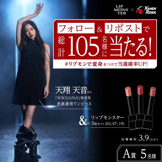 A賞:天翔天音さん「WWDJAPAN」特別号 表紙着用ワンピース&リップモンスター3色セット(03, 07, 19)5名様