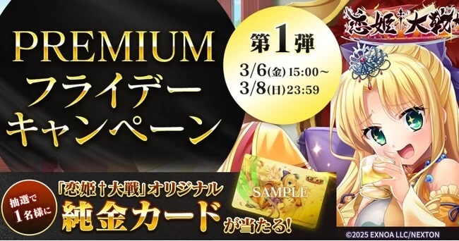 【X懸賞】オリジナル純金カードを1名様にプレゼント 2026.03.07恋姫大戦‐PREMIUMフライデーキャンペーン 賞品:オリジナル純金カード(1名様) 締切:2026年3月8日(日)お題に返信(リプライ)で回答することでご参加いただけるキャンペーンです。※詳細はキャンペーンページにてご確認ください。応募はこちらから