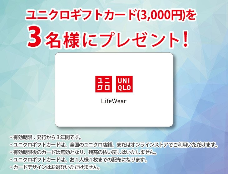 ユニクロギフトカード3,000円分を3名様にプレゼント 2026.03.07もしもドットネット‐プレゼントキャンペーン 賞品:ユニクロギフトカード3,000円分(3名様) 締切:2026年3月10日(火)アンケートに答えてご応募ください。※詳細はキャンペーンページにてご確認ください。応募はこちらから