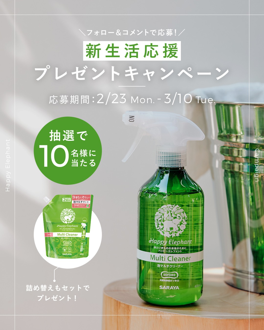 賞品:ハッピーエレファント 泡マルチクリーナー 本品&ハッピーエレファント 泡マルチクリーナー 詰替え用(10名様)