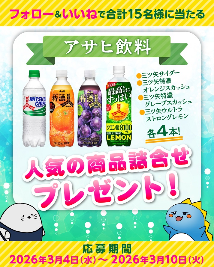 賞品:アサヒ飲料 ペットボトル飲料セット(15名様)