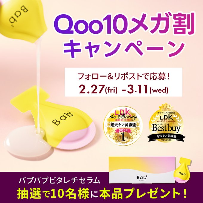 【X懸賞】Bab2 ビタレチセラムを10名様にプレゼント 2026.03.09Bab2(バブバブ)‐#Qoo10メガ割 キャンペーン 賞品:ビタレチセラム(10名様) 締切:2026年3月11日(水)公式X(Twitter)アカウントをフォロー&キャンペーン対象ポストをリポストしてご応募ください。※詳細はキャンペーンページにてご確認ください。応募はこちらから