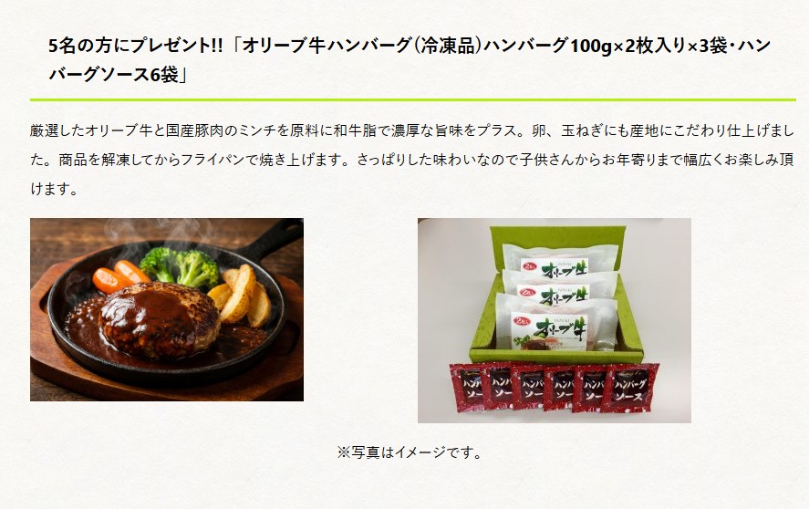 オリーブ牛ハンバーグ(冷凍品)ハンバーグ100g×2枚入り×3袋・ハンバーグソース6袋を5名様にプレゼント 2026.03.09JA香川県 今月のプレゼント 賞品:オリーブ牛ハンバーグ(冷凍品)ハンバーグ100g×2枚入り×3袋・ハンバーグソース6袋(5名様) 締切:2026年3月31日(火)クイズに答えてご応募ください。※詳細はキャンペーンページにてご確認ください。応募はこちらから