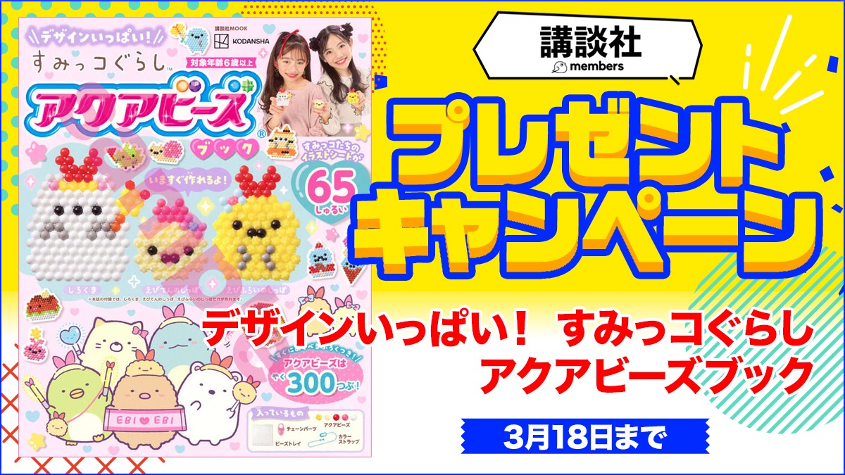 『デザインいっぱい!すみっコぐらし アクアビーズブック』を3名様にプレゼント 2026.03.09講談社‐プレゼントキャンペーン 賞品:『デザインいっぱい!すみっコぐらし アクアビーズブック』(3名様) 締切:2026年3月18日(水)ご応募には会員登録/ログインが必要です。※詳細はキャンペーンページにてご確認ください。応募はこちらから