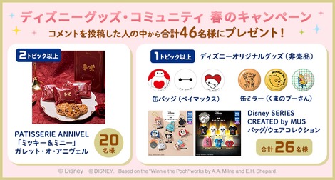 期間中、「ディズニーグッズ・コミュニティ」内で対象トピックにコメントを投稿していただいた方の中から合計46名様にディズニーグッズをプレゼント!