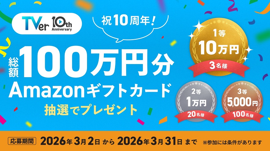 期間中に応募エントリーを完了し、かつ指定の条件でTVerを視聴された方の中から、抽選で合計123名様に賞品(Amazonギフトカード)をプレゼント!