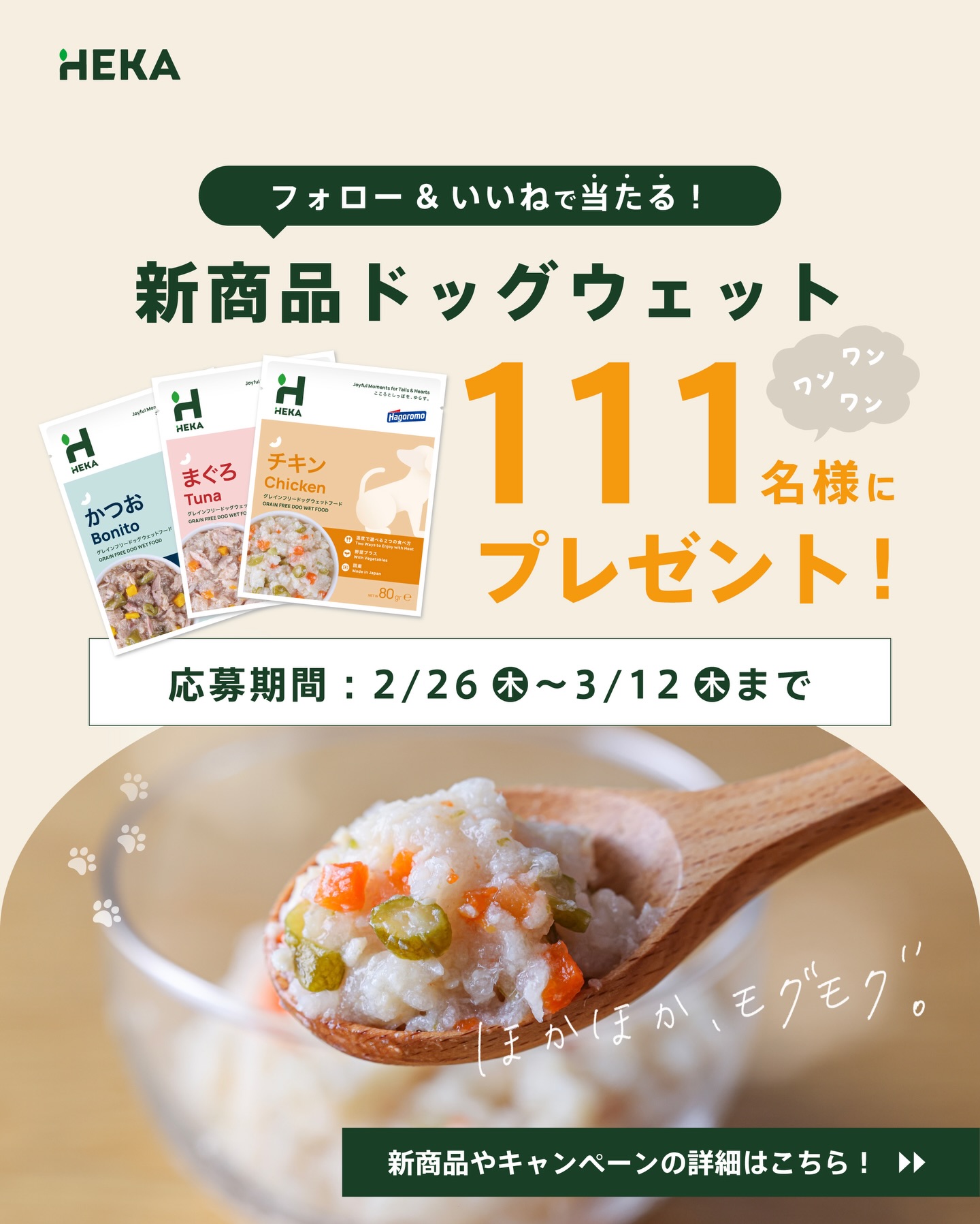 賞品:HEKAグレインフリードッグウェットフード(111名様)
